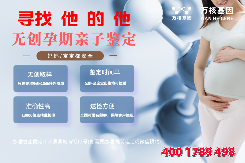 文县无创DNA亲子鉴定办理地址:陇南市文县县城南街11号(如需要办理 提前电话或微信预约)-预约电话:4001789498,文县服务地区包括:武都区、成县、文县、宕昌县、康县、西和县、礼县、徽县、两当县等文县周边城市。